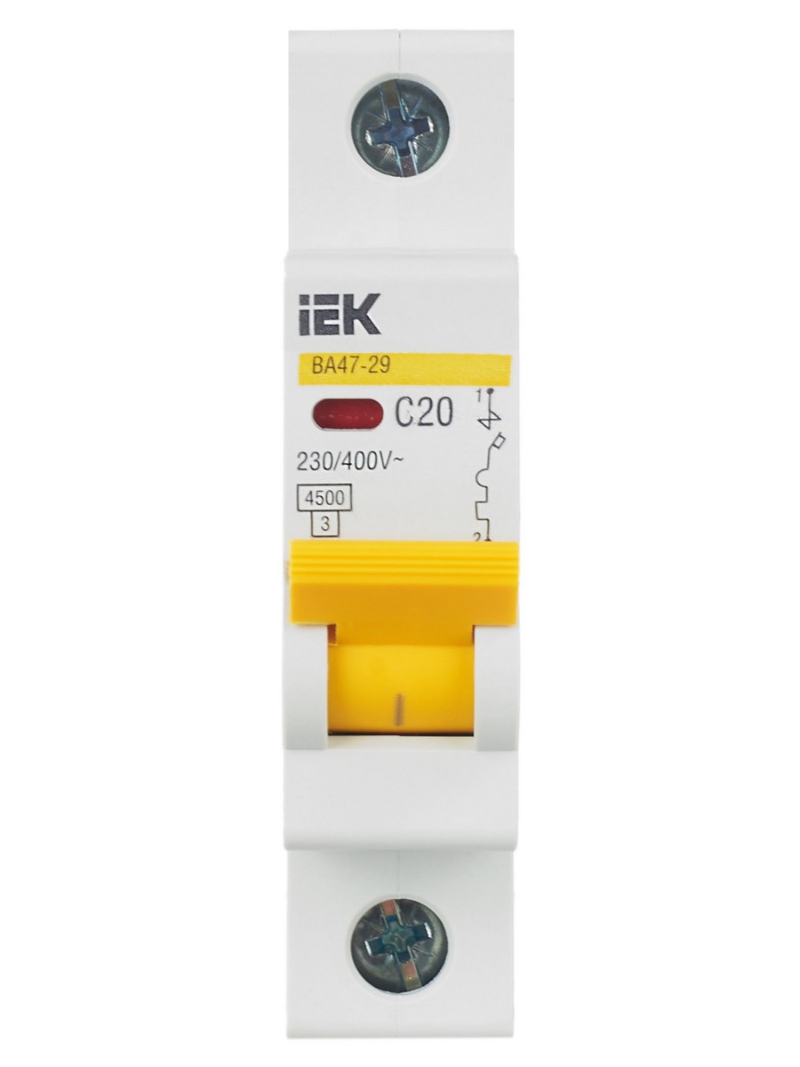 Автоматический выключатель IEK KARAT ВА47-29 1Р 20А 4,5кА (артикул MVA20-1-020-C) обеспечивает надежную защиту распределительных и групповых цепей с различной нагрузкой. Подходит для электроприборов и освещения (характеристика В), двигателей с небольшими пусковыми токами (характеристика C) и устройств с большими пусковыми токами (характеристика D). Рекомендуется для использования в вводно-распределительных устройствах жилых и общественных зданий. Номинальный ток: 20А. Производитель: IEK.