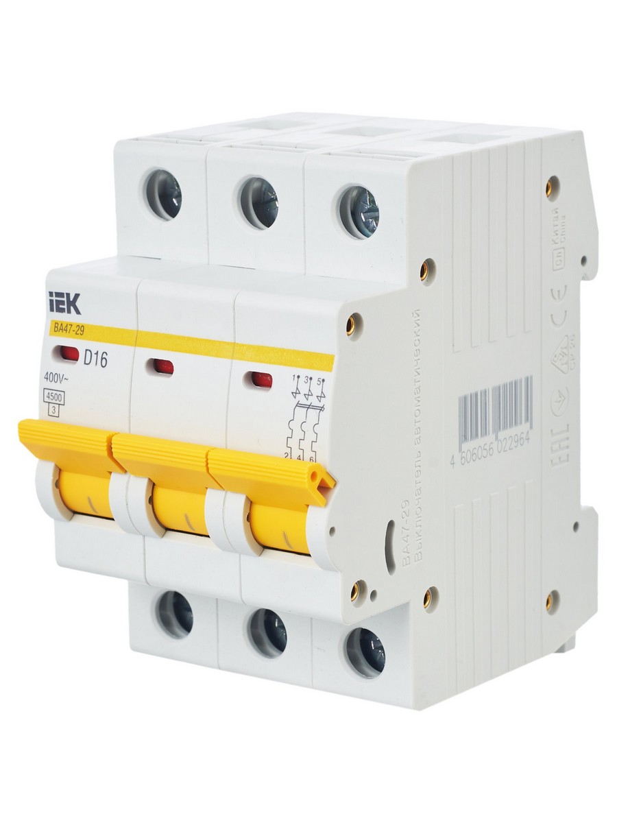 Автоматический выключатель IEK KARAT ВА47-29 3Р 16А 4,5кА х-ка D MVA20-3-016-D по цене 838 руб. с фотографией и техническими характеристиками. Для покупки товара нажмите кнопку "Купить" и перейдите в корзину или позвоните по телефону 8 (495) 585 32 60 или 8 (800) 222 23 53.