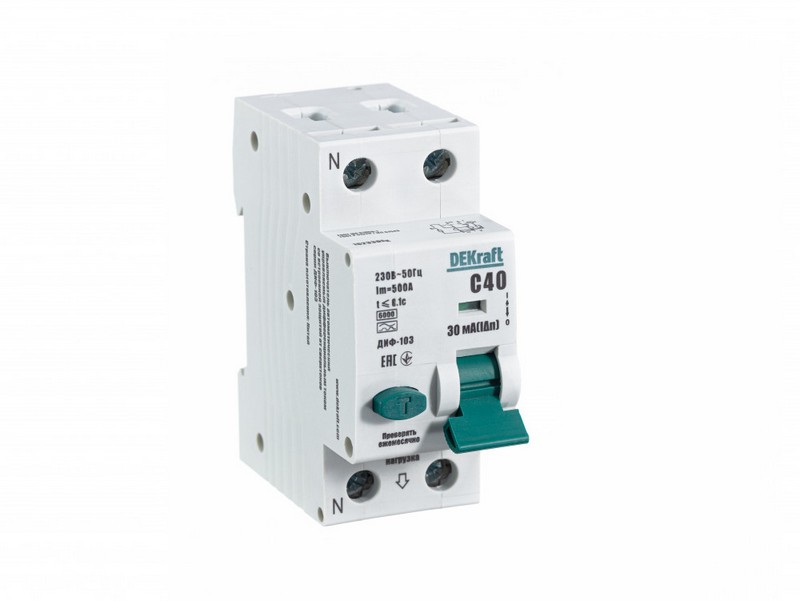 Автоматические выключатели дифференциального тока серии ДИФ-103 6кА NEW Dekraft; 1P+N; номинальный ток 40 А; ном. диф. ток 30 мА; тип диф. расцепителя - AC; кривая отключения - С; Icn, Ics = 6 кА; тип устройства - электронный; монтаж – на DIN-рейку. АВДТ обеспечивают три вида защиты - от короткого замыкания, перегрузки и возникновения утечки тока (в частности, вследствие прикосновения человека к токоведущим частям).