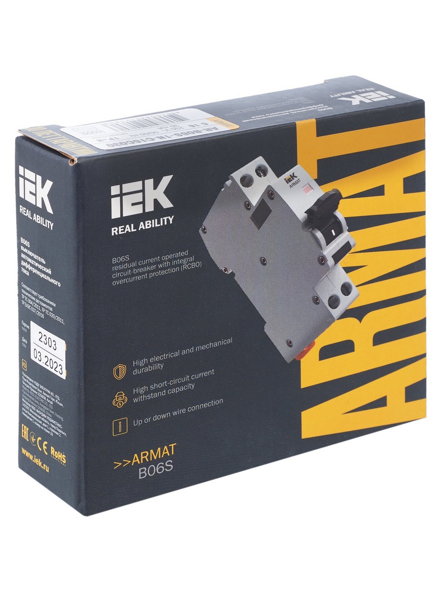 Автоматический выключатель дифференциального тока ARMAT B06S от производителя IEK (ИЭК) имеет артикул AR-B06S-1N-C16C030. Этот надежный АВДТ предназначен для защиты от токов перегрузки, короткого замыкания и токов замыкания на землю, что делает его незаменимым для обеспечения безопасности в электрических системах. Устройство имеет 2 полюсные конструкции и номинальный ток 16А с отключающим дифференциальным током 30 мА, что соответствует требованиям для защиты человека от электрического удара. Номинальная отключающая способность данного выключателя составляет 6 кА, что обеспечивает надежность под нагрузкой. АВДТ ARMAT B06S подходит как для бытового, так и для коммерческого использования, сочетая функциональность и безопасность в компактном формате 18мм.