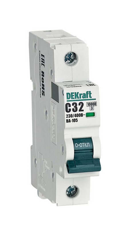 Автоматический выключатель серии ВА-105 DEKraft; 1P; ном. ток 32 А; характеристика В; откл. способность 10 кА; ширина модуля 18мм. Аппараты имеют механизм мгновенной коммутации, 6 монолитных заклепок, которые повышают прочность корпуса. Боковые каналы охлаждения повышают стабильность работы при высоких температурах окружающей среды. Есть возможность установки дополнительных аксессуаров с левой стороны устройства. Аппарат на 100% совместим с корпусами и оболочками DEKraft и Systeme Electric.