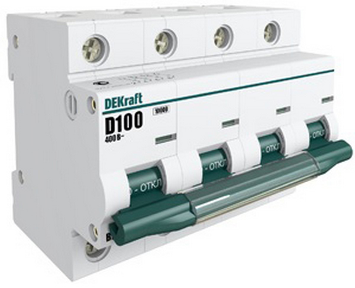 Автоматический выключатель серии ВА-201 DEKraft; 4P; номинальный ток 100 А; характеристика D; отключающая способность 10 кА; ширина модуля 27мм. Монолитная лицевая панель обеспечивает безопасную эксплуатацию аппарата. Окошко-индикатор всегда показывает состояние аппарата вне зависимости от положения рукоятки управления. Двухпозиционная защелка облегчает монтаж выключателя. Аппарат на 100% совместим с корпусами и оболочками DEKraft, Systeme Electric.