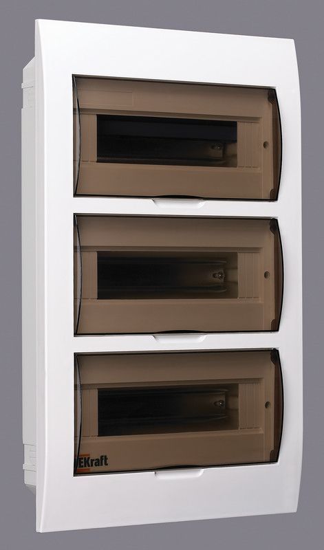 Корпус пластиковый Dekraft ЩРВ-П-36 предназначен для встраиваемой установки модульного электрооборудования. Поддерживает номинальный ток до 100 А и включает 36 модулей по 18 мм в трех рядах. Размеры: 503х341х102 мм. Изготовлен из прочного ABS-пластика, белого цвета, с дверцей из прозрачного стекла и защитой IP41. В комплекте оцинкованные DIN-рейки, шины N и PE, наклейки для маркировки и крепежные элементы. Идеален для жилых и промышленных объектов.