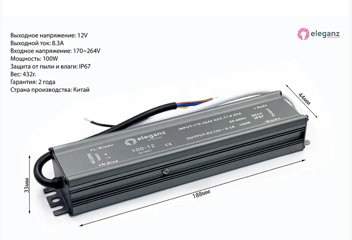 Блок питания Eleganz 12V 100W IP20 предназначен для преобразования переменного тока 220В в постоянный 12В, обеспечивая стабильную работу светодиодных лент и других устройств. Рекомендуется учитывать запас мощности +20% для надежной эксплуатации. Степень защиты IP20 подходит для использования в помещениях.