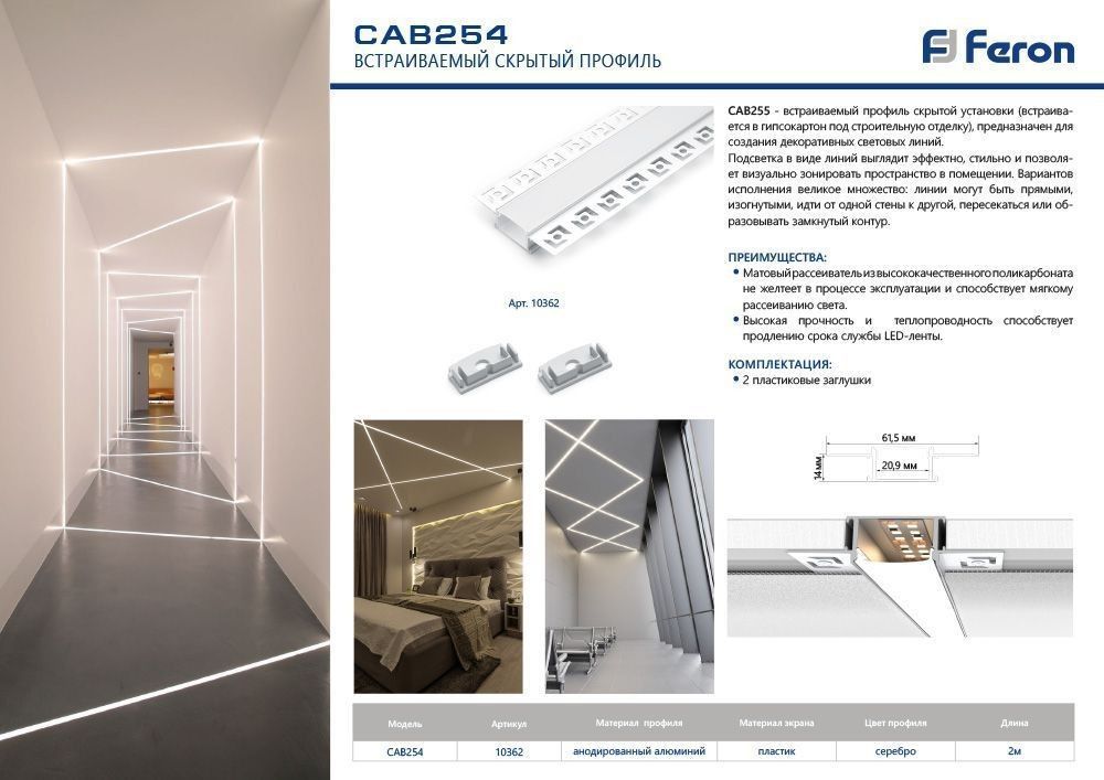 Профиль Feron для светодиодной ленты встраиваемый серебро CAB254 10362 по цене 1 395 руб. с фотографией и техническими характеристиками. Для покупки товара нажмите кнопку "Купить" и перейдите в корзину или позвоните по телефону 8 (495) 585 32 60 или 8 (800) 222 23 53.
