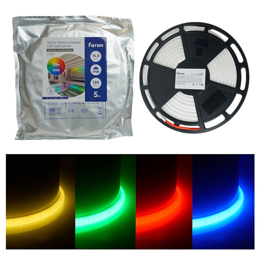 Светодиодная лента Feron LS551 24V RGB (артикул 48731) - это идеальное решение для создания атмосферного освещения в самых различных условиях. С мощностью 14,4 Вт/м и 120 диодами SMD 4040 на метр, она обеспечивает яркое и насыщенное свечение. Степень защиты IP68 гарантирует водонепроницаемость, что делает ленту подходящей для использования как в помещениях, так и на открытом воздухе, включая ванные комнаты и террасы.