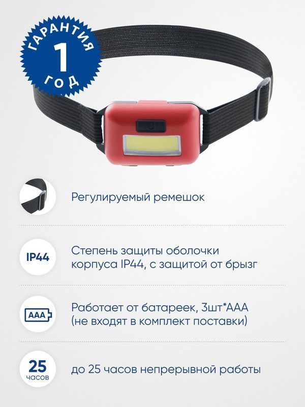 Фонарь на батарейках FERON TH2308 фонарь головной , IP44, , количество режимов 2, время работы 25, цвет красный, 50*40*25мм