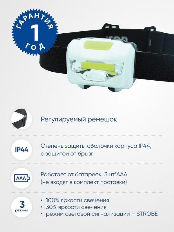 Фонарь налобный Feron TH2300 на батарейках 3*AAA 3W 1COB IP44 пластик 41679 по цене 294 руб. с фотографией и техническими характеристиками. Для покупки товара нажмите кнопку "Купить" и перейдите в корзину или позвоните по телефону 8 (495) 585 32 60 или 8 (800) 222 23 53.