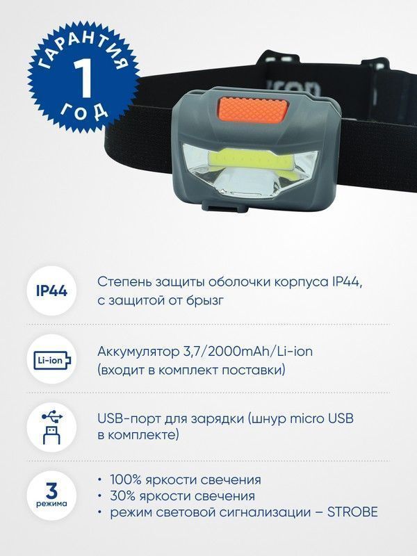 Фонарь с аккумулятором FERON TH2301 фонарь головной , 1LED IP44, аккумулятор 3,7/2000mAh/Li-ion, количество режимов 3, время зарядки 2 часа, время работы 10 часов, цвет серый, 60*42*35мм