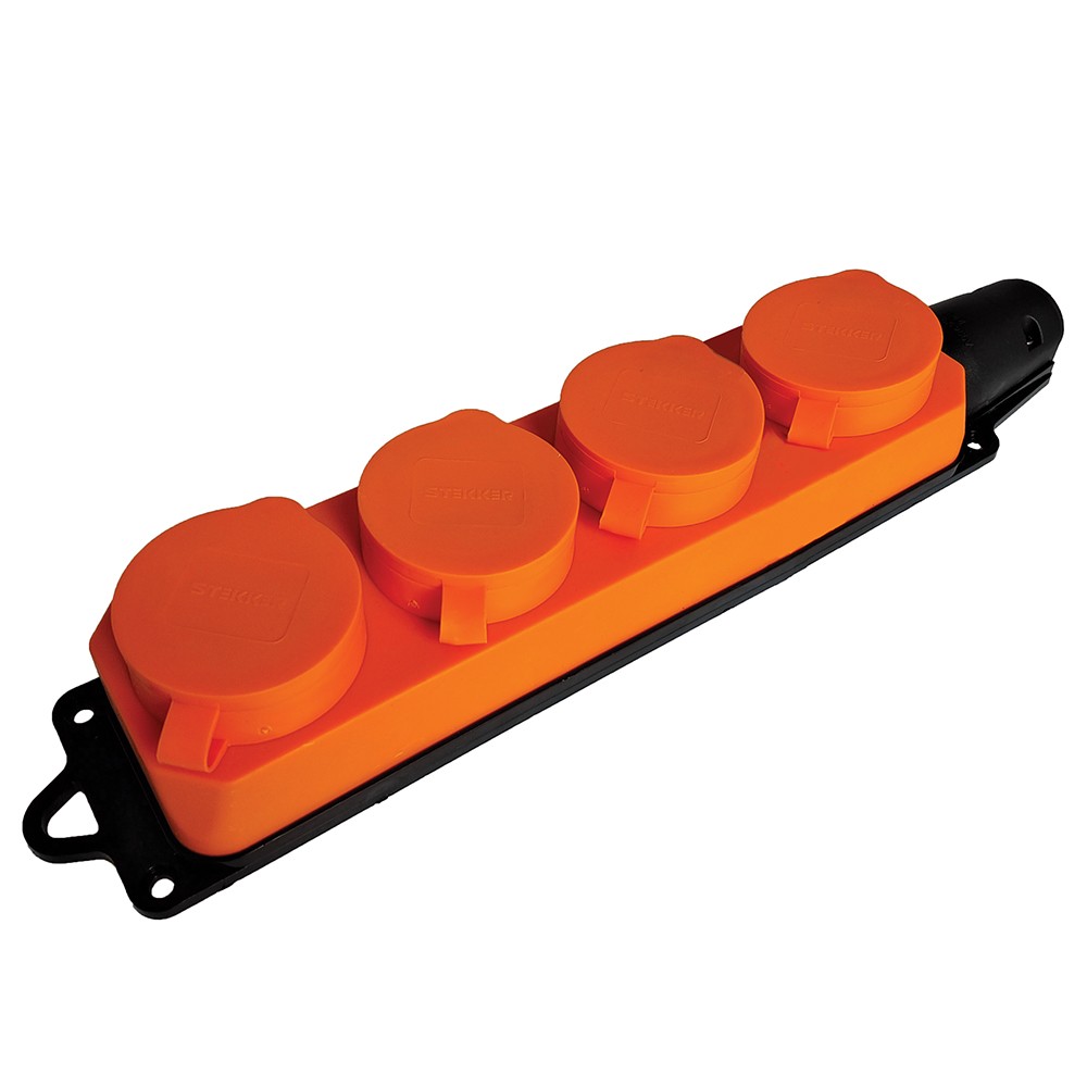 Розетка  STEKKER RST16-24-44-5  на 4 гнездо, с крышкой, с заземлением. Материал: каучук, цвет оранжевый, размер 197*66*51мм. Номинальное напряжение 250, номинальный ток 16А, диапазон рабочих температур  +1..+35°C, IP44