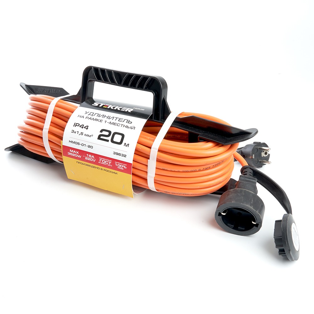 Удлинители STEKKER HM05-01-20, серия Home, цвет оранжевый, длина 20 м, количество розеток 1, латунь, сечение кабеля 1.5 мм2, тип кабеля ПВС, материал кабеля медь, ток 16А, напряжение 220В, максимальная нагрузка 3520Вт, тип вилки - угловая. Диапазон рабочих температур  +1..+35°C, степень защиты IP44, класс защиты от поражения эл. током 1, размеры изделия 380*140*135. Гарантия 2 года.