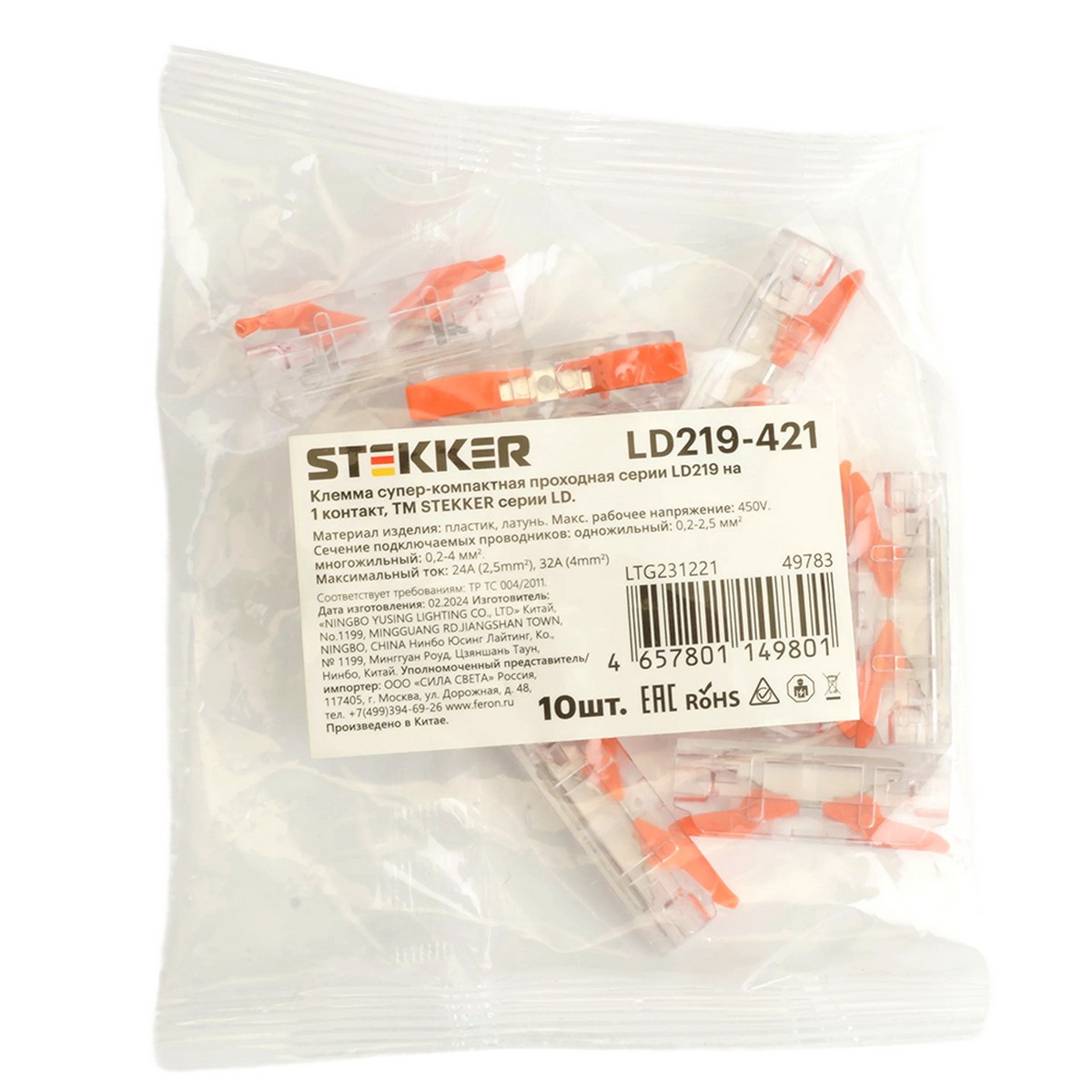 Клемма пружинная компактная STEKKER LD219-421, 2-проводная 0,2-4мм2, 450В, 32А, без пасты, материал изделия поликарбонат, медь. Тип провода одножильный/многожильный, материал провода медь, температура окружающей среды -40..+50