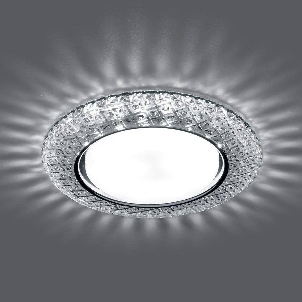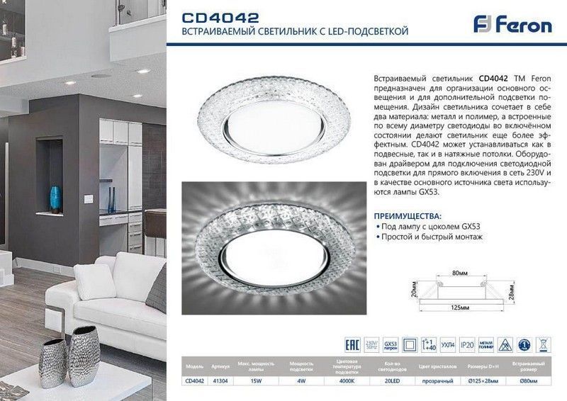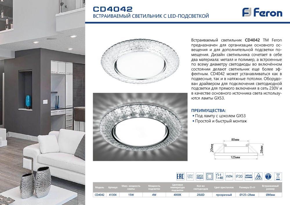 Светильник потолочный встраиваемый (ФВО) FERON CD4042, под лампу с LED подсветкой 20LED*2835 SMD 4000K, GX53 GX53, прозрачный хром, круг, 125*125*28 мм, монтажный диаметр 80мм, корпус полимер, неповоротный