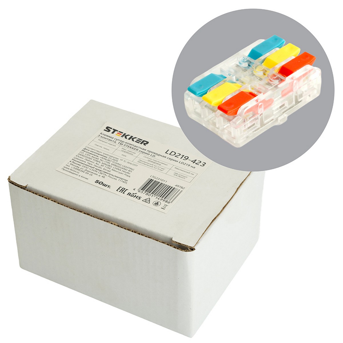 Клемма пружинная компактная STEKKER LD220-102, 3-проводная 0,2-4мм2, 450В, 32А, без пасты, материал изделия полиамид 6.6, латунь. Тип провода одножильный/многожильный, материал провода медь, температура окружающей среды -20...+40°C