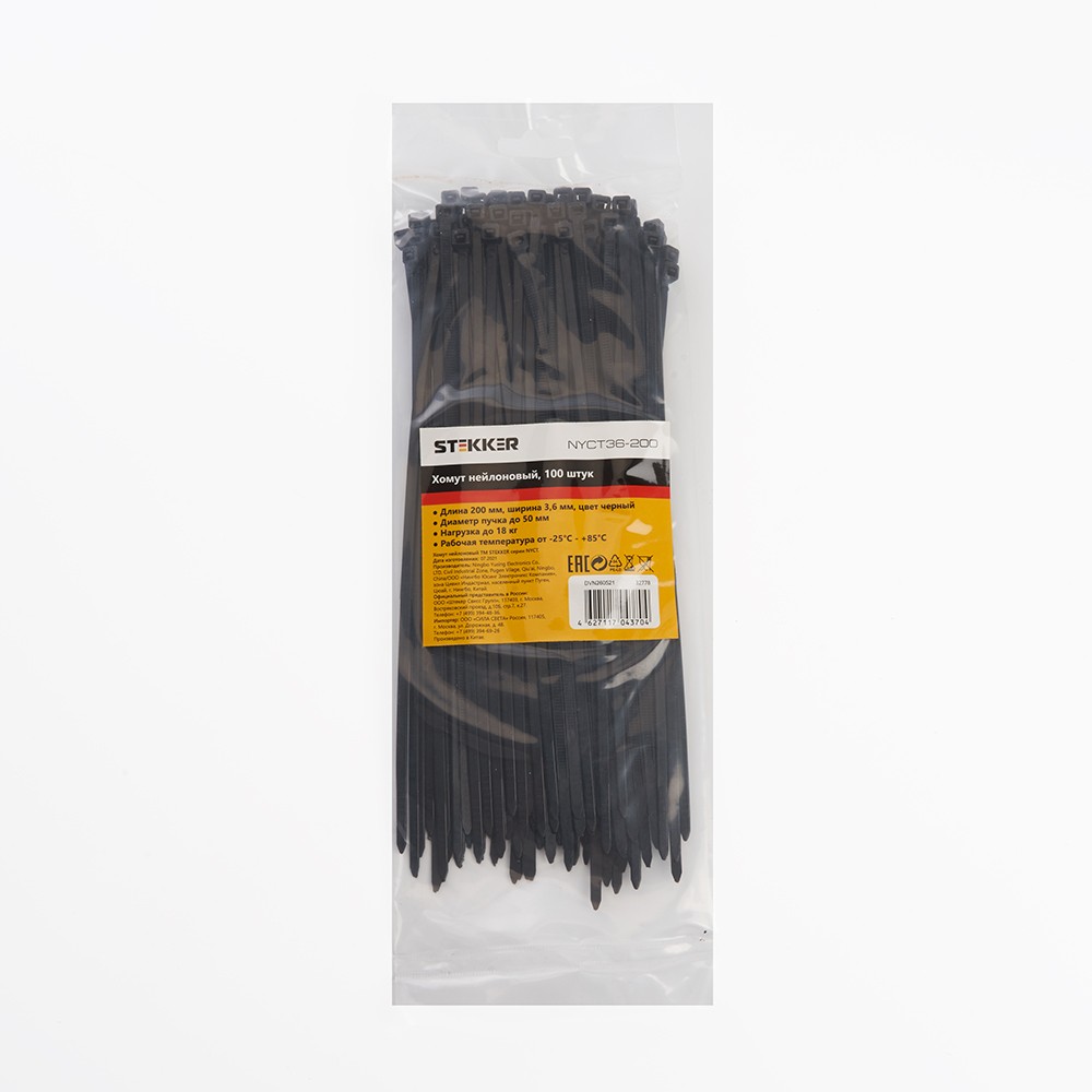 Хомут электромонтажный STEKKER NYCT36-200, одноразовый, черный, материал - нейлон , максимальный диаметр пучка - 50мм, нагрузка - 18кг, диапазон рабочих температур -25°C - +85°C, рекомендуемая температура хранениня +5°C - +25°C