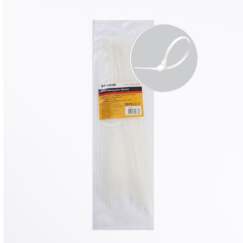 Хомут электромонтажный STEKKER NYCT36-300, одноразовый, белый, материал - нейлон , максимальный диаметр пучка - 80мм, нагрузка - 18кг, диапазон рабочих температур -25°C - +85°C, рекомендуемая температура хранениня +5°C - +25°C