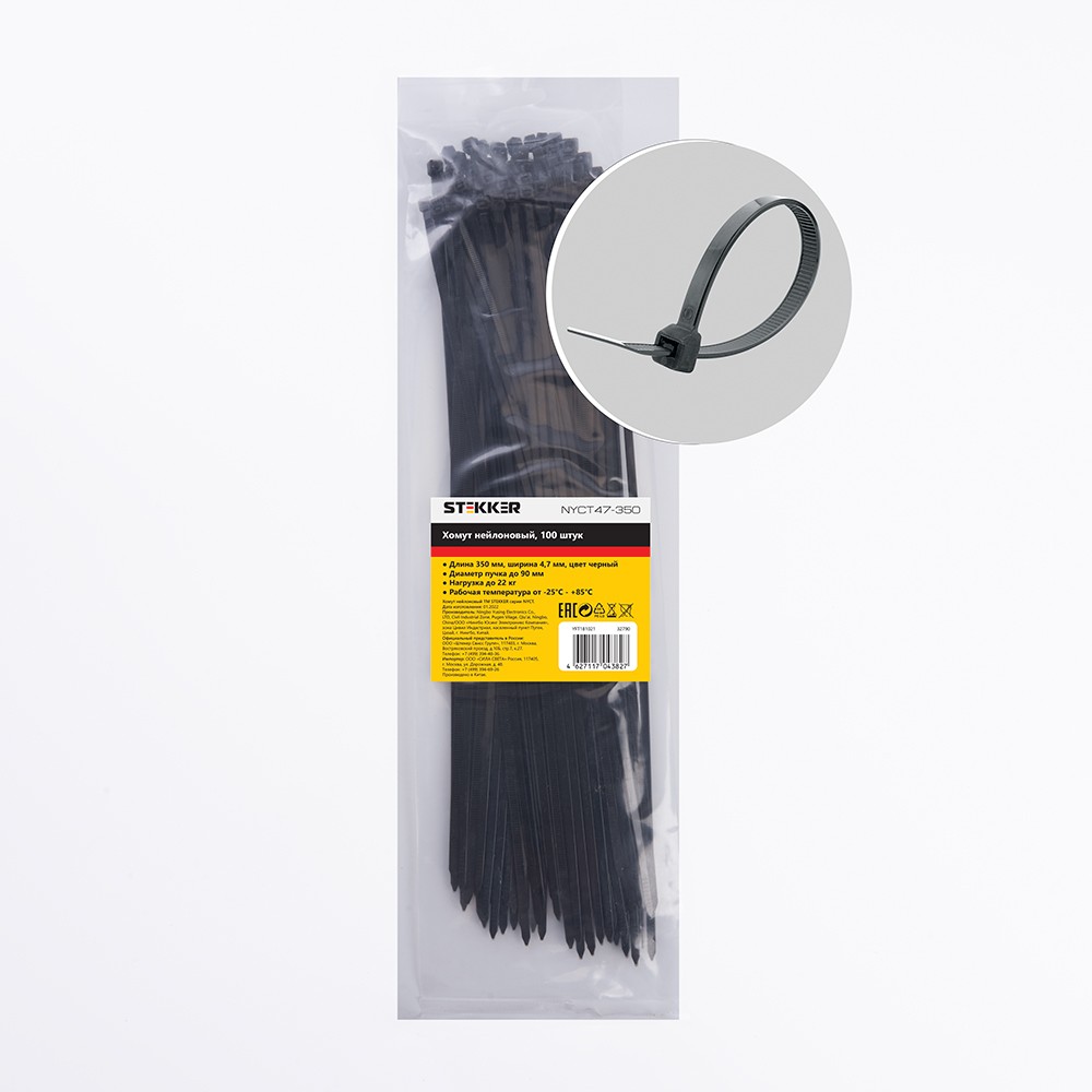 Хомут электромонтажный STEKKER NYCT47-350 , одноразовый, черный, материал - нейлон , максимальный диаметр пучка - 90мм, нагрузка - 22кг, диапазон рабочих температур -25°C - +85°C, рекомендуемая температура хранениня +5°C - +25°C