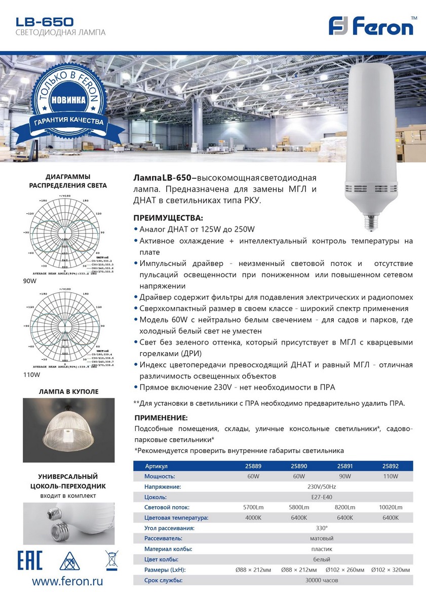 Лампа светодиодная Feron LB-650 E27-E40 60W 6400K 25890 по цене 450 руб. с фотографией и техническими характеристиками. Для покупки товара нажмите кнопку "Купить" и перейдите в корзину или позвоните по телефону 8 (495) 585 32 60 или 8 (800) 222 23 53.