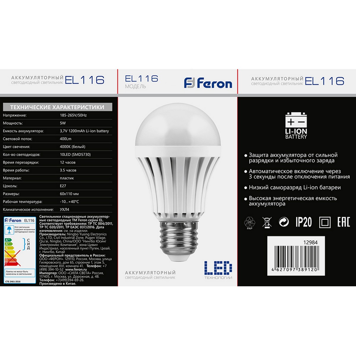 Светильник Feron EL116 аккумуляторный 5W Е27 AC/DC белый 12984 по цене 333 руб. с фотографией и техническими характеристиками. Для покупки товара нажмите кнопку "Купить" и перейдите в корзину или позвоните по телефону 8 (495) 585 32 60 или 8 (800) 222 23 53.
