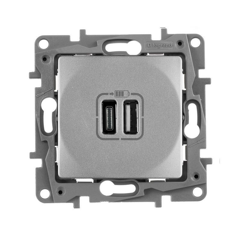 Артикул 672435: USB розетка Legrand ETIKA в алюминиевом цвете сочетает стиль и функциональность. Предназначена для быстрой и удобной зарядки устройств, обеспечивая надежность и долговечность. Идеально впишется в современный интерьер, предлагая высокое качество от производителя Legrand.