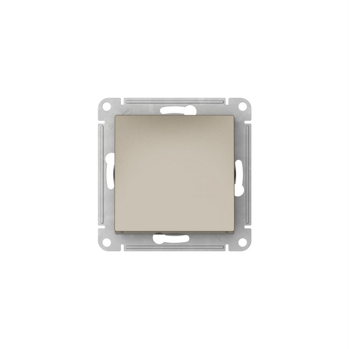 Механизм с быстрозажимными клеммами 1-клавишного выключателя в сборе Systeme Electric (ранее Schneider Electric) серии AtlasDesign в цвете шампань подходит для сетей 250 В, на ток 10 А.