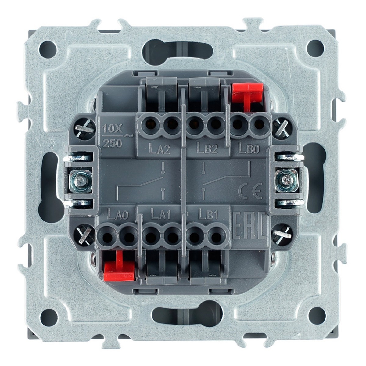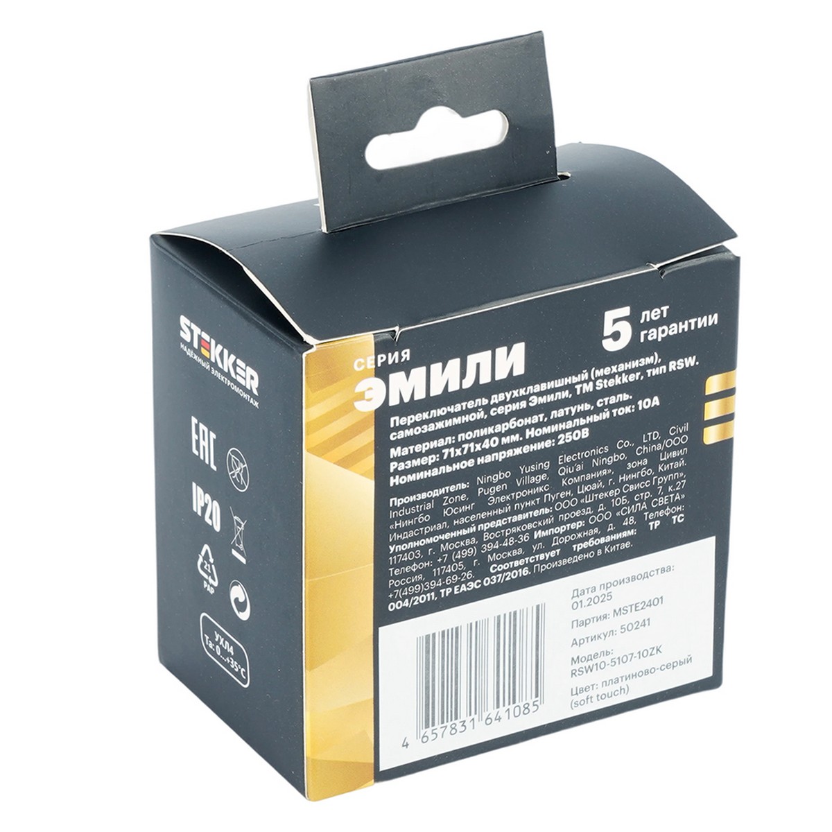 Выключатели двухклавишный STEKKER RSW10-5107-10ZK, серия Эмили тип установки - скрытый, размер изделия 70*70*43мм., цвет платиново-серый, soft touch, материал изделия поликарбонат, латунь, сталь. Номинальное напряжение 250 , номинальный ток 10А, 20