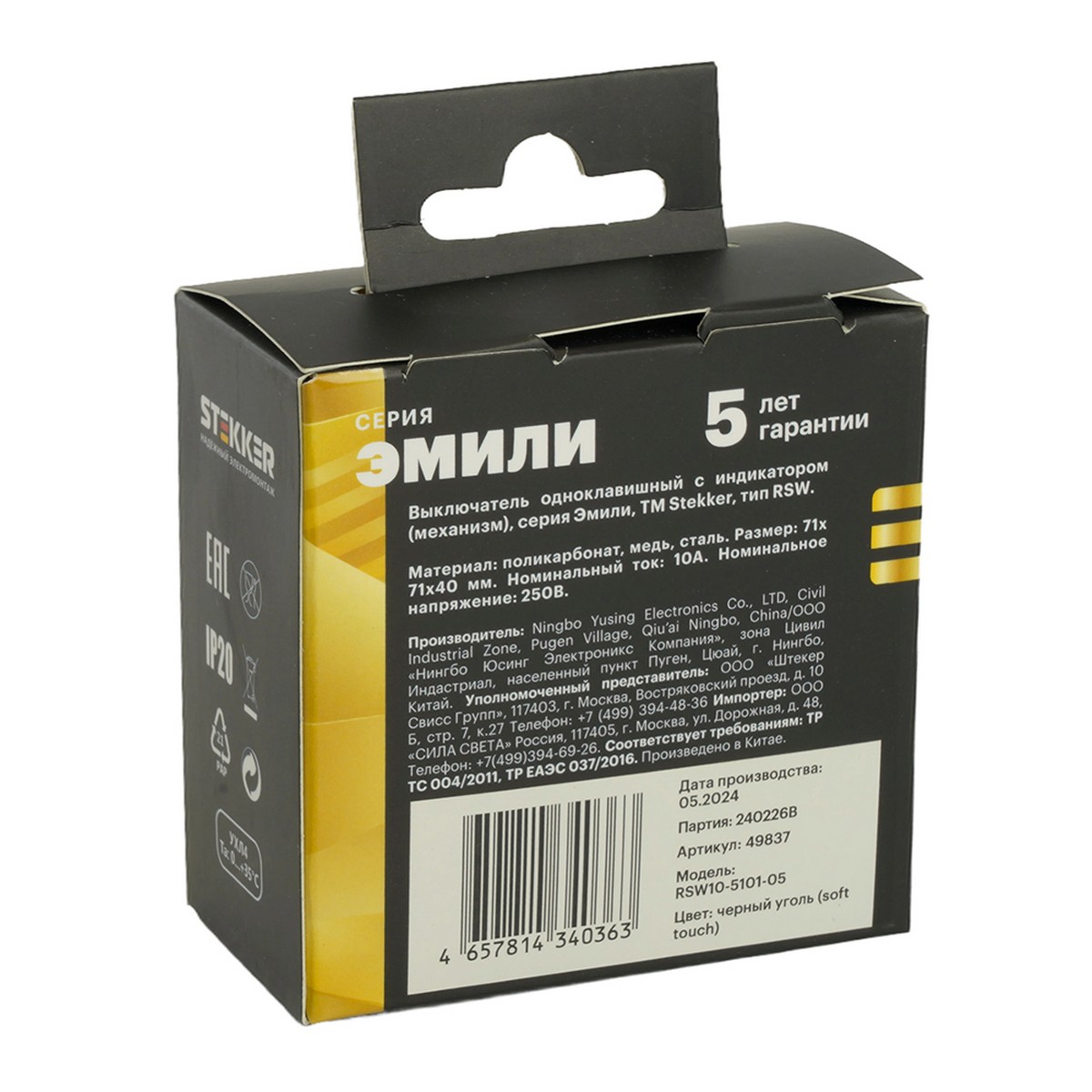 Выключатель 1-клавишный с индикатором STEKKER Эмили RSW10-5101-05 — это стильное решение для вашего интерьера. Выполненный в элегантном цвете черный уголь с текстурой soft touch, он идеально впишется в любой дизайн. Серия Эмили сочетает в себе простоту форм и высокую функциональность, что делает ее востребованной за качество и долговечность. Выключатель рассчитан на номинальное напряжение 250 В и ток 10 А, что обеспечивает надежную работу в ежедневной эксплуатации. Он изготовлен из стойких к воздействию материалов: корпус из поликарбоната не поддерживает горение, а токоведущая часть выполнена из оловяннофосфорной бронзы. Установка осуществляется скрытым способом, а гальванизированный суппорт гарантирует прочность конструкции. Размеры 71x71x40 мм делают устройство компактным и удобным. Эмили — это гармония стиля и надежности в одном решении для вашего дома.