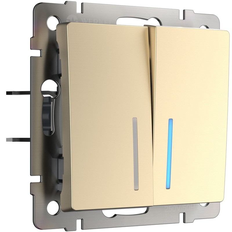 Выключатель Werkel двухклавишный проходной с подсветкой (шампань) W1122111 — идеальное решение для управления освещением и вентиляцией в жилых и общественных зданиях. С номинальным током 10 А и напряжением ~250 В, он подходит для установки в любых электрических сетях. Особенностью модели является возможность управления нагрузкой с нескольких мест, совместно с промежуточными выключателями.