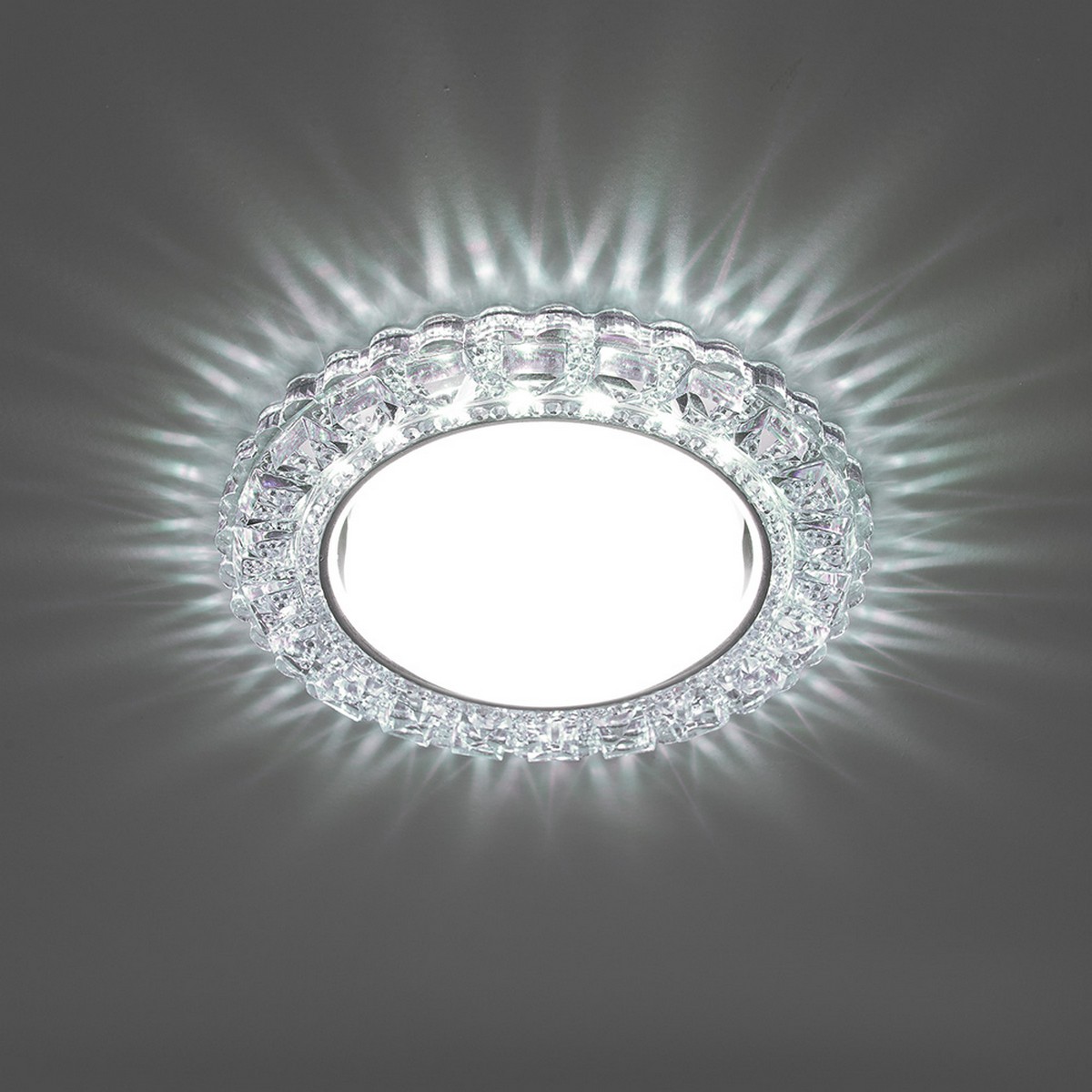 За счёт рельефного края светильника, который подсвечивается встроенной диодной лентой изнутри, на потолке создаётся красивый, лучистый рисунок. Светильник оборудован драйвером для подключения светодиодной подсветки для прямого включения в сеть 230V и в качестве основного источника света используются лампы GХ5З.