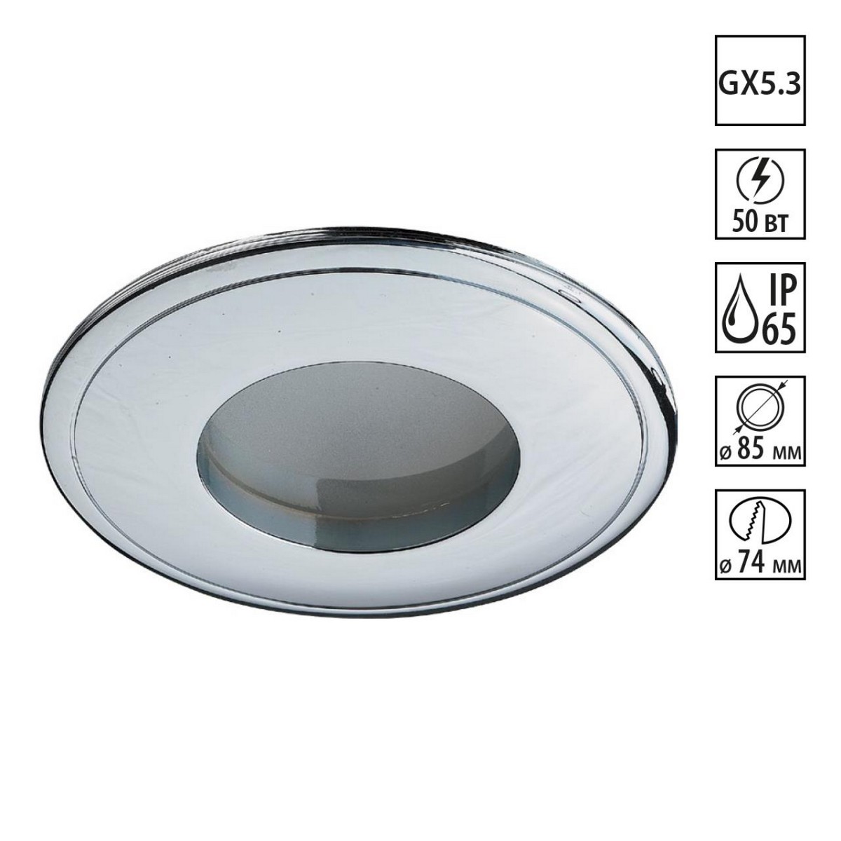 Встраиваемый неповоротный светильник с повышенной степенью пылевлагозащиты (IP44) подходит для установки во влажные помещения. Лампа в комплект не входит.