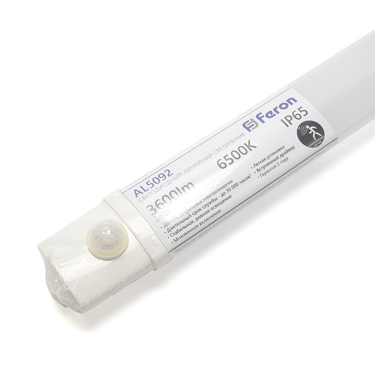 Светильник светодиодный Feron AL5092 линейный с ИК-датчиком 36W 6500K IP65 белый 48156 по цене 1 635 руб. с фотографией и техническими характеристиками. Для покупки товара нажмите кнопку "Купить" и перейдите в корзину или позвоните по телефону 8 (495) 585 32 60 или 8 (800) 222 23 53.
