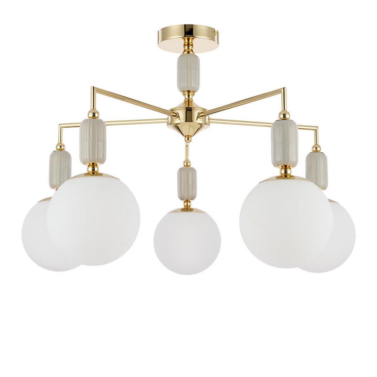 Люстра ODEON LIGHT 5405/6 Palle — выразительный акцент в интерьере, сочетающий элегантность и функциональность. Этот светильник уникален благодаря своей воздушной конструкции с элементами ручной работы. Особая гофрированная керамика серых оттенков, дополненная акцентной светло-зеленой кисточкой и черными стеклянными бусинами, создает неповторимый образ. Металлические детали, выполненные с покрытием из золотой гальваники, придают изделию роскошь и статус.