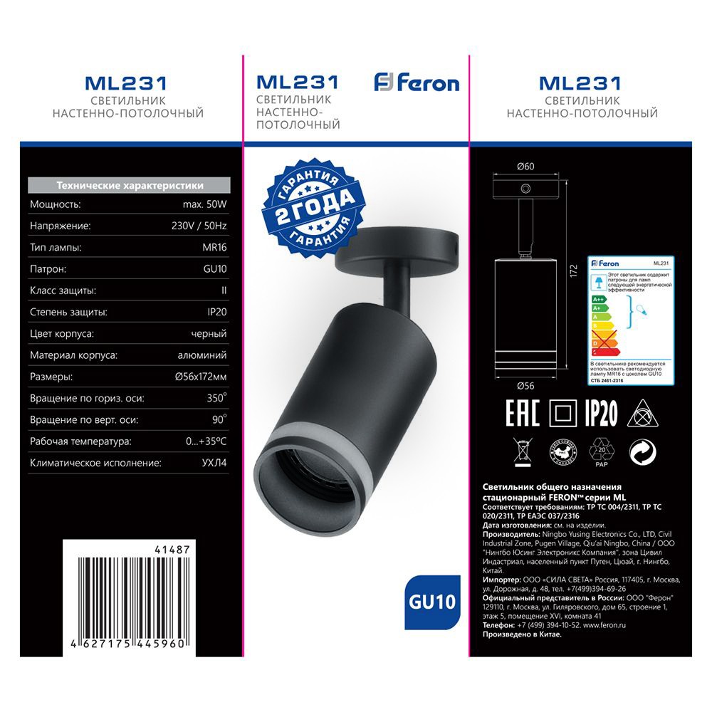Светильник спот Feron ML231 настенно-потолочный GU10 черный 41487 по цене 558 руб. с фотографией и техническими характеристиками. Для покупки товара нажмите кнопку "Купить" и перейдите в корзину или позвоните по телефону 8 (495) 585 32 60 или 8 (800) 222 23 53.