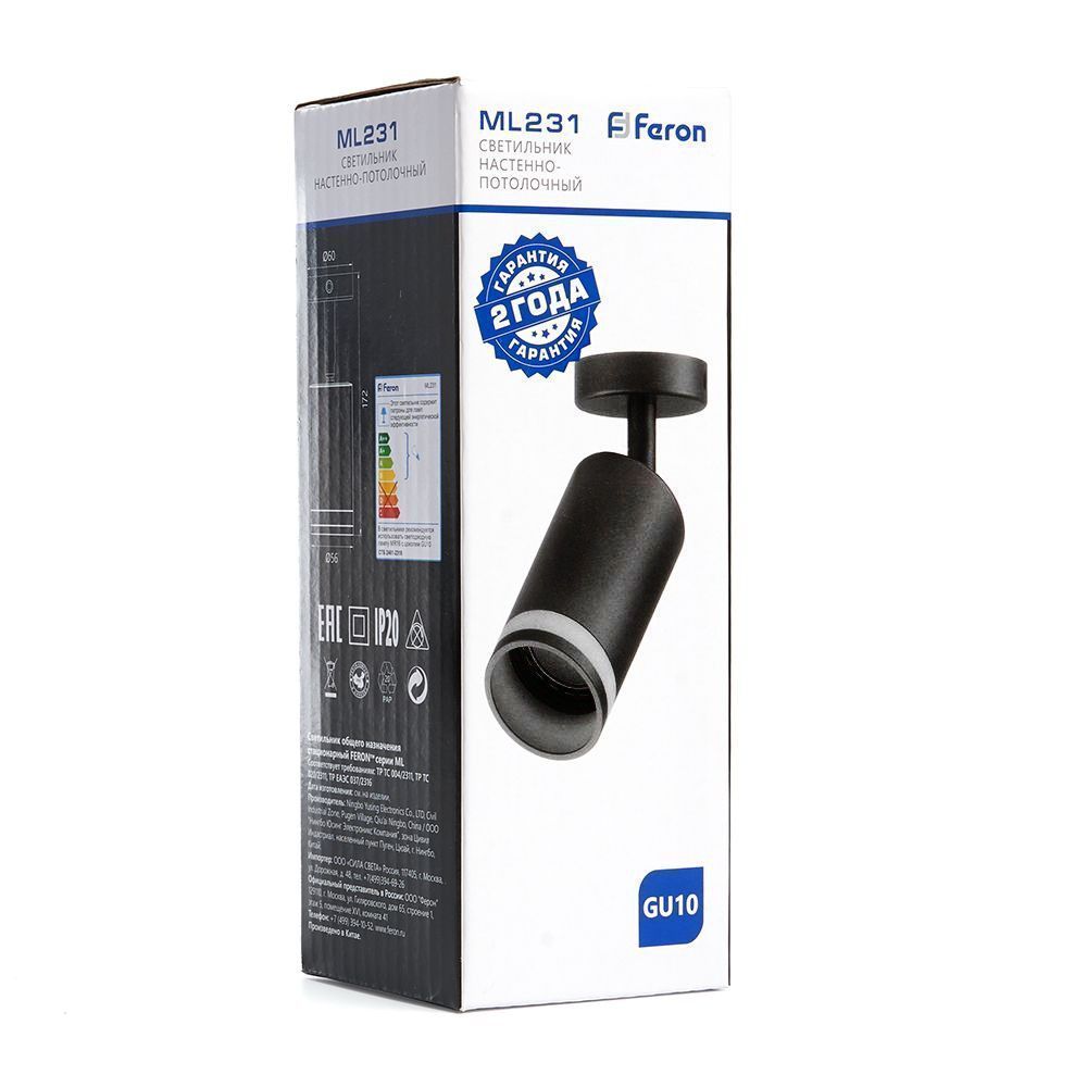 Современный светильник спот создаст уютное освещение в любом интерьере. Можно использовать как основное или акцентное освещение в любом помещении. Модель ML231 от производителя Feron в цвете Черный и типом лампы GU10 которая обеспечивает мощность 50 Ватт обеспечит Вас качественным светом. А универсальный крепеж (в комплекте) позволяет установить светильник на любую поверхность. Светильник накладной под лампу, (ИВО) FERON ML231, GU10 50W, 230V, IP20, цвет черный, корпус алюминий, 56*56*172