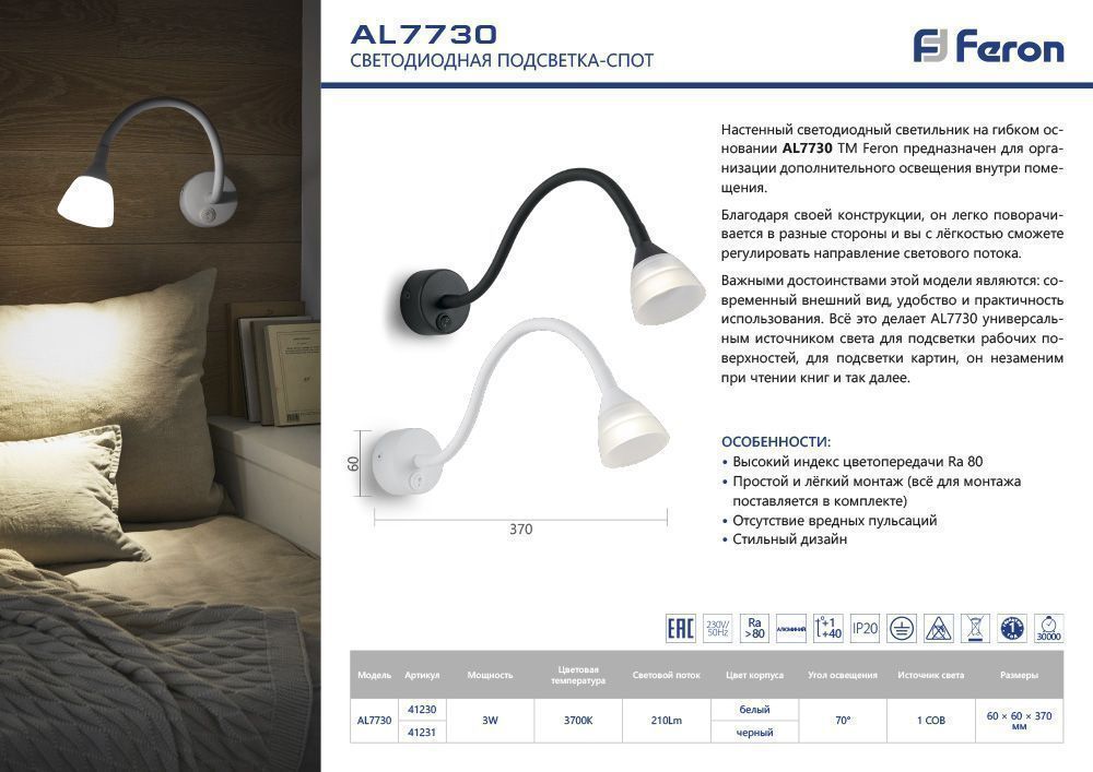 Светильник спот светодиодный Feron AL7730 черный 3W прикроватный 41231 по цене 583 руб. с фотографией и техническими характеристиками. Для покупки товара нажмите кнопку "Купить" и перейдите в корзину или позвоните по телефону 8 (495) 585 32 60 или 8 (800) 222 23 53.