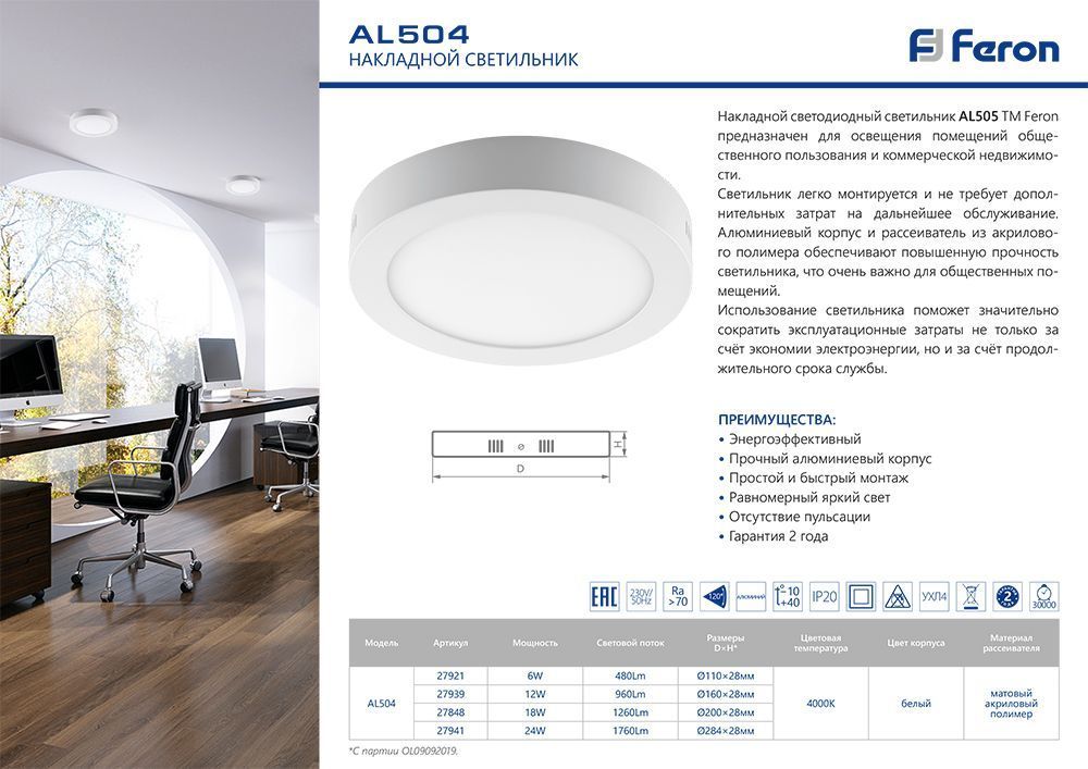 Накладной светодиодный светильник AL504 TM Feron артикул 27921 предназначен для освещения помещений общественного пользования и коммерческой недвижимости.