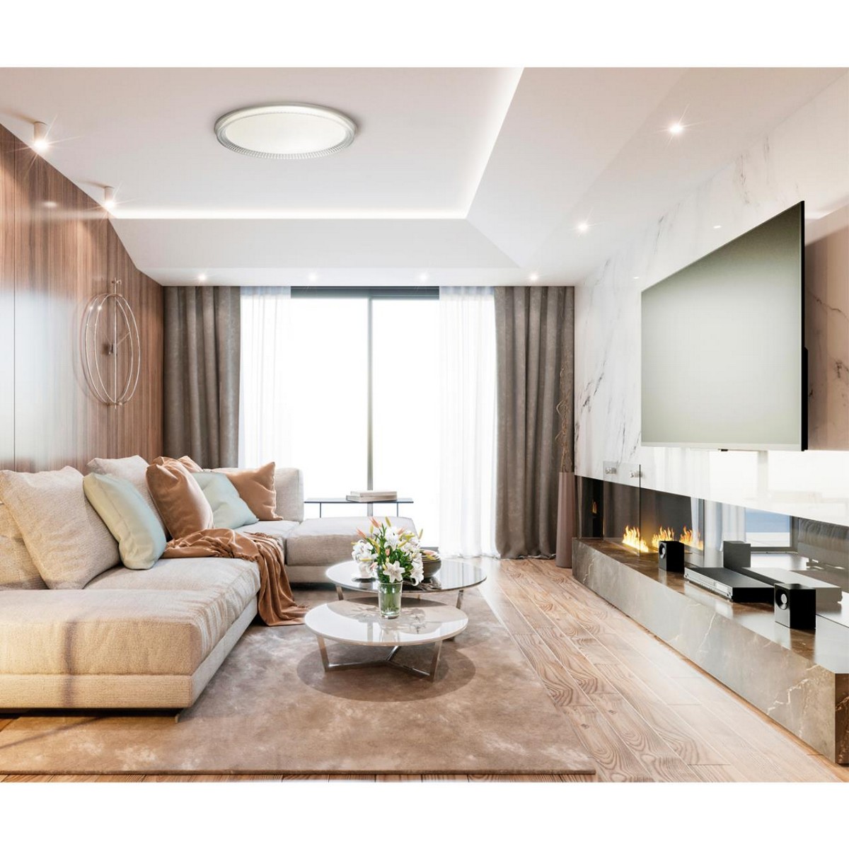 Светильник 7643/DL линии DEPAX состоит из металлического основания (базы) и пластикового рассеивателя. Материал рассеивателя - высококачественный пластик марки PMMA 2.0 белого цвета с гладкой матовой поверхностью, обеспечивающий светильнику равномерное рассеивание и хорошее светопропускание. Форма плафона: круглая, декорирована рельефным ободом из пластика прозрачного цвета. Благодаря прозрачному ободу светильник имеет увеличенный угол рассеивания света. Степень защиты IP43 позволяет использовать светильник в определенных зонах влажных помещений. В комплект входит заменяемый LED модуль с линзами, мощностью 48Вт, которая соответствует лампе накаливания 460Вт. Источник света имеет комфортную цветовую температуру 4000К (белый свет).