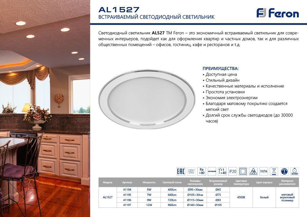 Светильник встраиваемый светодиодный Feron AL1527 12W 4500K белый 41197 по цене 582 руб. с фотографией и техническими характеристиками. Для покупки товара нажмите кнопку "Купить" и перейдите в корзину или позвоните по телефону 8 (495) 585 32 60 или 8 (800) 222 23 53.