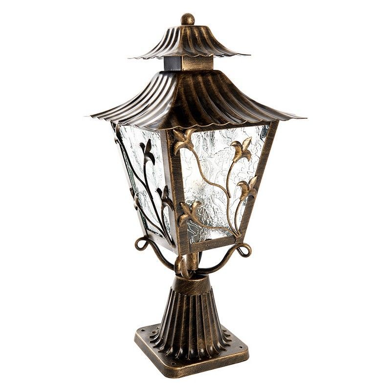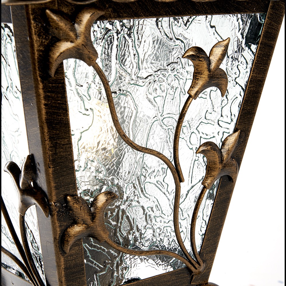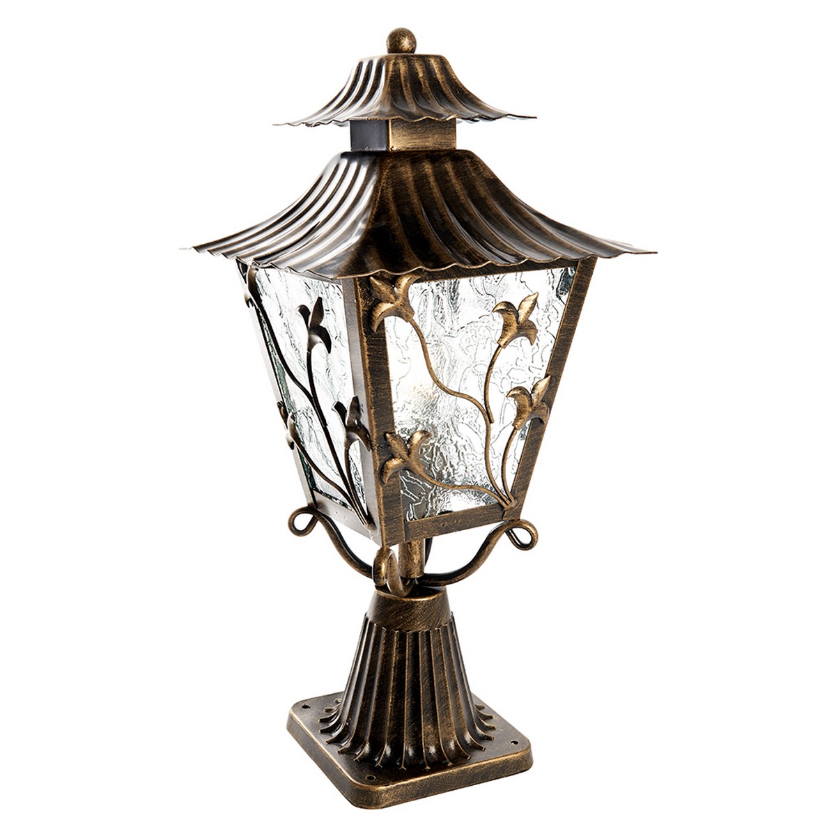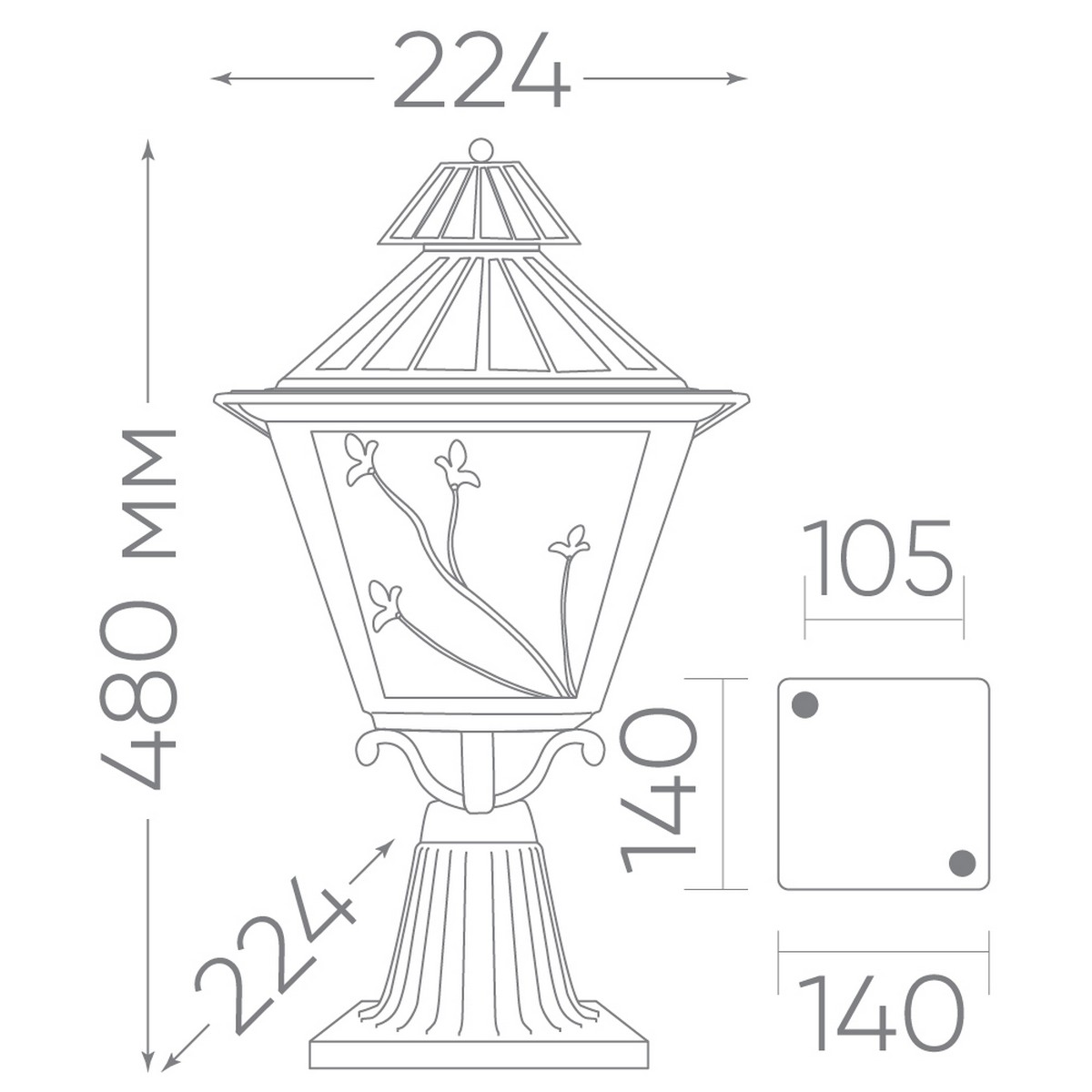 Конструктивно светильник представлен в форме четырехгранника, размерами 224*224*480 мм, что делает его компактным, но вместе с тем достаточно заметным элементом. Прочный материал из металла и стекла защищен от коррозии и может беспрепятственно эксплуатироваться в любых погодных условиях благодаря степени защиты IP44. Этот светильник идеально подойдет для освещения дачного участка, сада или придомовой территории, добавляя благородные акценты в ландшафтный дизайн.