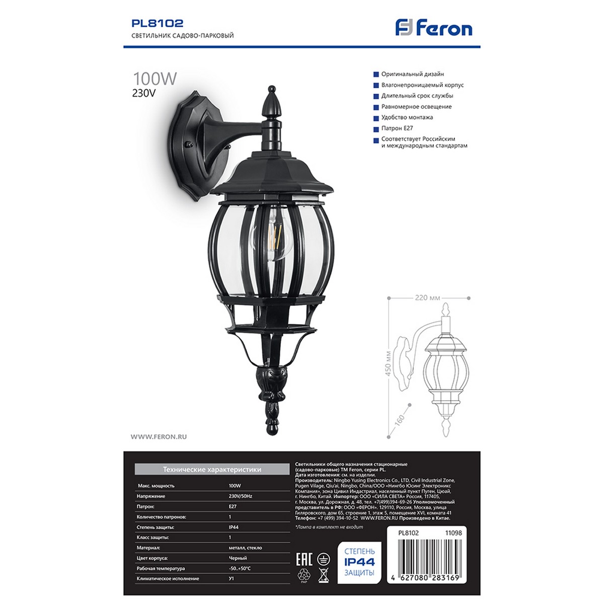 Размеры светильника составляют 160*220*450 мм, что делает его компактным, но в то же время способным осветить значительную площадь. Произведено компанией Feron, известной своим качеством и надежностью.