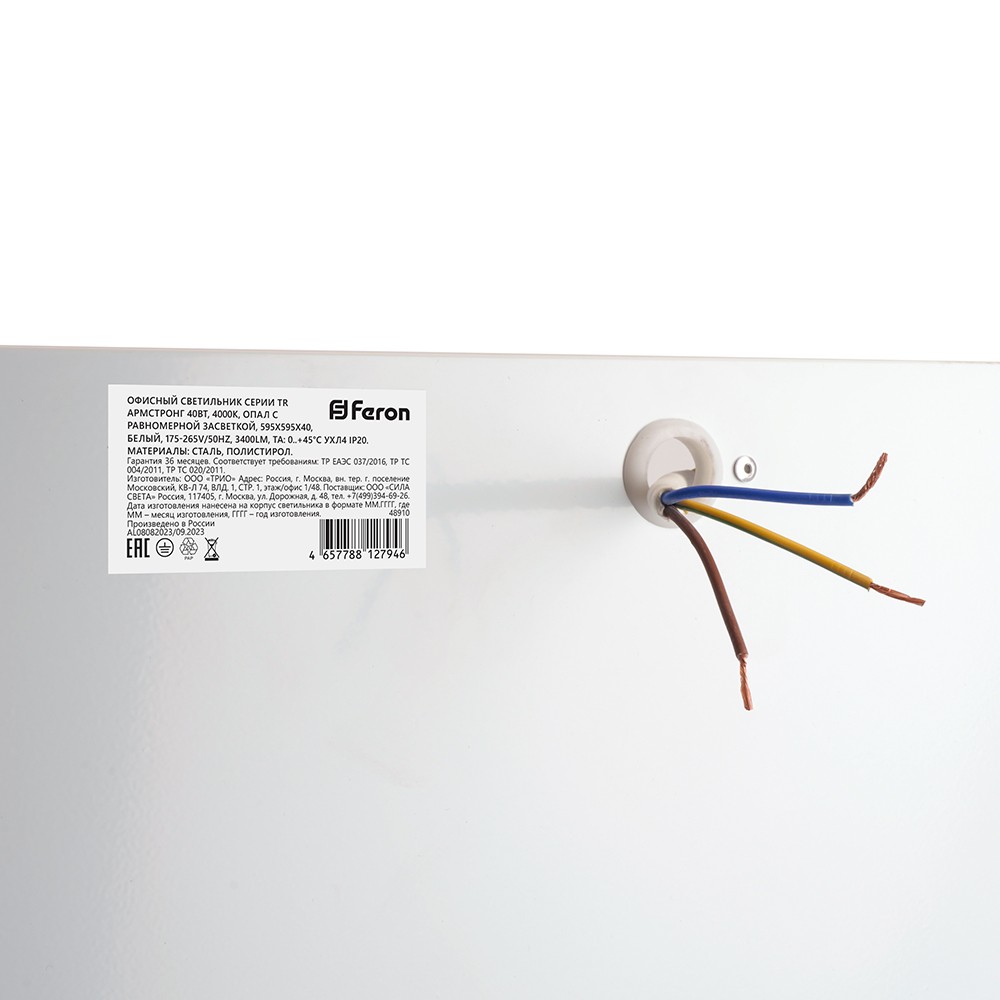 Офисный светильник серии TR Армстронг 40Вт 4000К опал (артикул 48910) от производителя Feron — это идеальное решение для оформления освещения в офисах и коммерческих помещениях. Этот встраиваемый светильник обеспечивает равномерное распределение света благодаря углу рассеивания в 120°, создавая комфортную атмосферу для работы. С мощностью 40Вт и световым потоком 3400 люмен, он обеспечивает яркое нейтральное белое освещение (4000K), которое соответствует современным требованиям освещения. Сделанный из стали с полистирольным рассеивателем, он не только прочен, но и элегантно вписывается в любой интерьер. Размеры светильника составляют 595x595x40 мм, что идеально подходит для потолков типа Армстронг. Простота установки (встраиваемый или накладной монтаж) и надежность делают TR Армстронг универсальным выбором для любых условий!