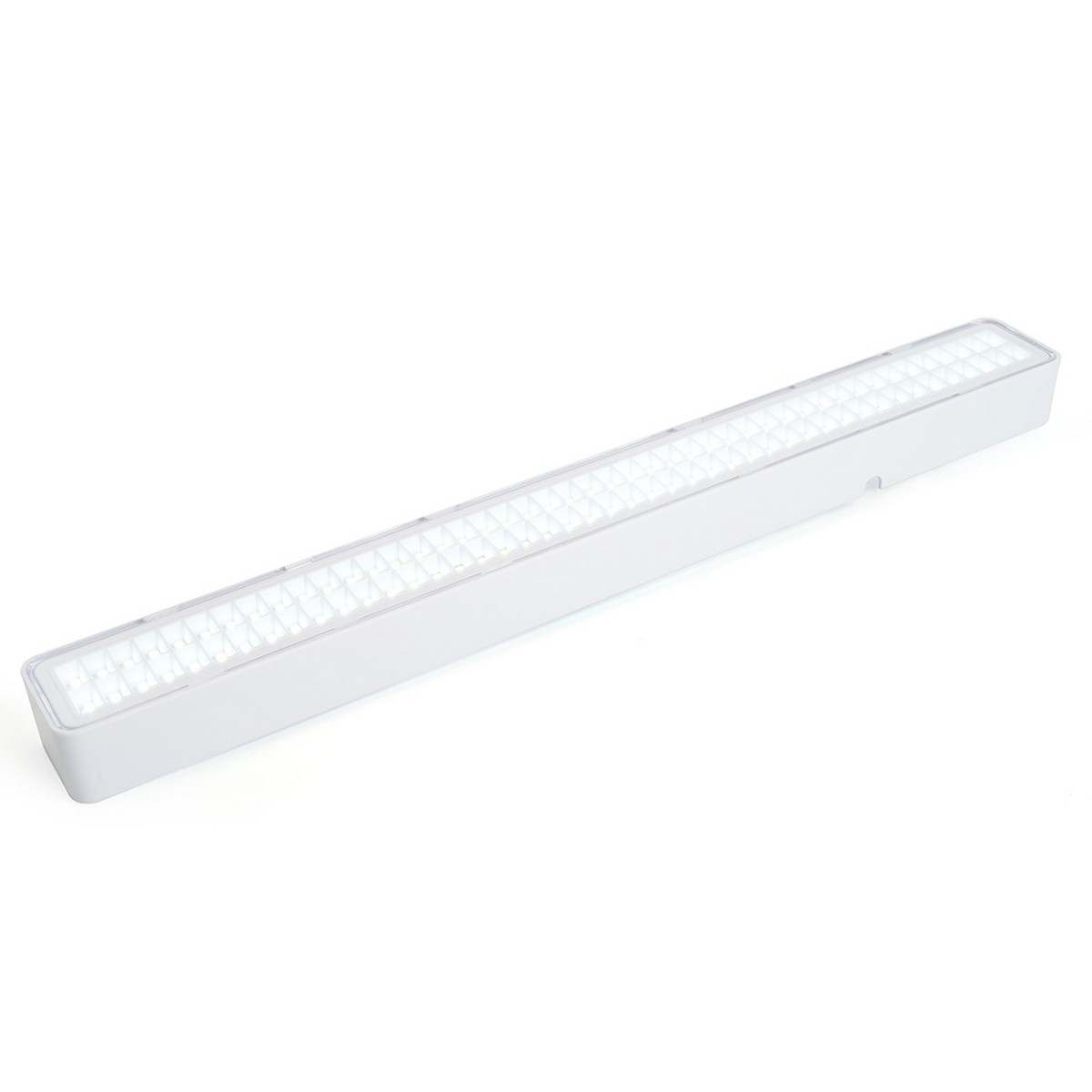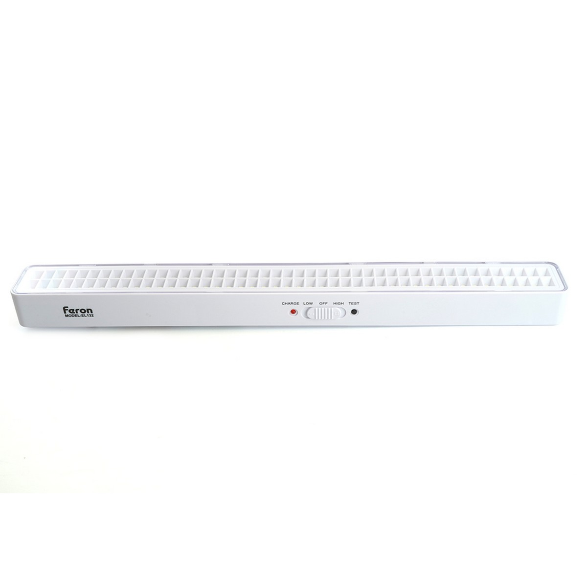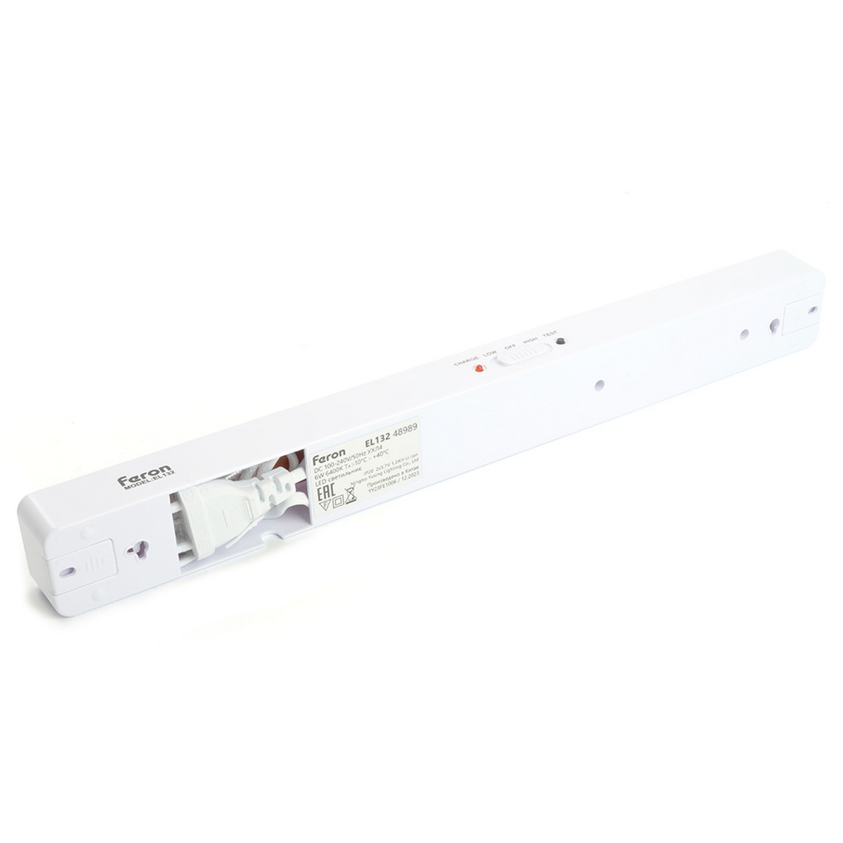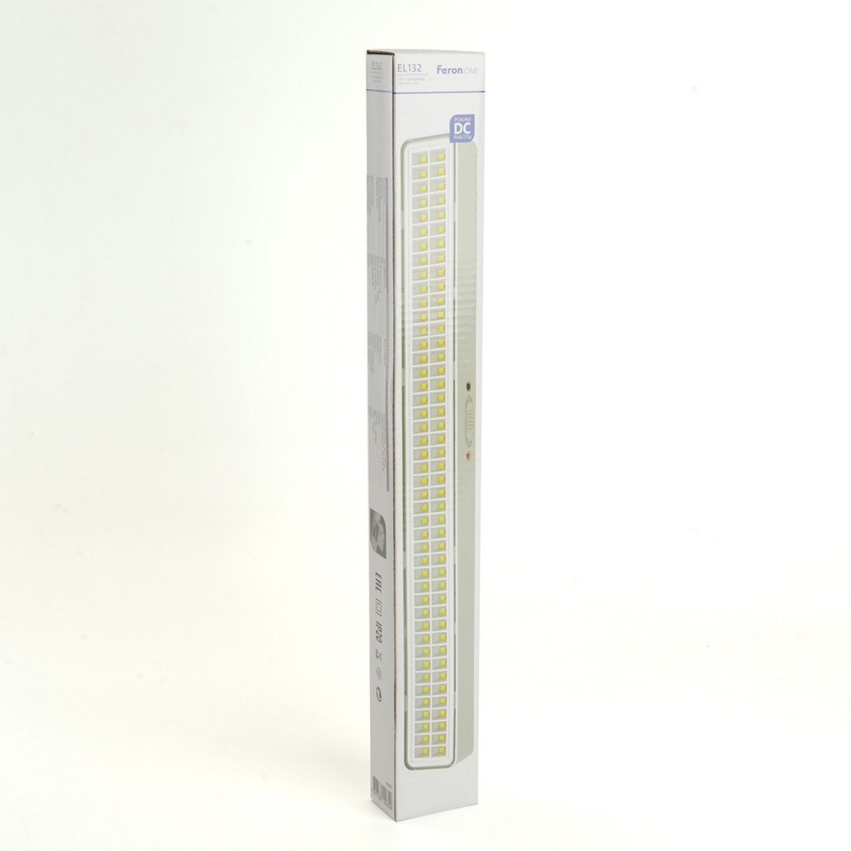 Светильник аккумуляторный FERON EL132 DC, 90LED/дневной, 100-240V, IP20, аккумулятор 2*3,7/1200mAh/Li-Ion (литий-ионный), количество режимов 2, время зарядки 24 часа, время работы 2/4часов, цвет белый, 380*43*28.5мм