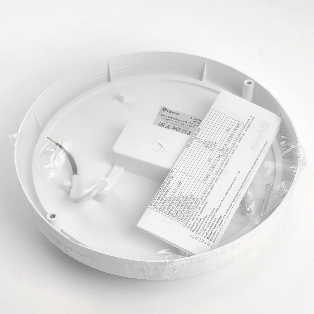 Мощность светильника составляет 24 Вт, что обеспечивает яркость в 1920 люмен. Он работает от сети 220V, что делает его легко интегрируемым в существующие электросети без дополнительных устройств. Корпус и рассеиватель изготовлены из прочного пластика, что делает светильник легким и долговечным. Размеры светильника 210x210x50 мм и круглая форма обеспечивают удобство установки и современный внешний вид.