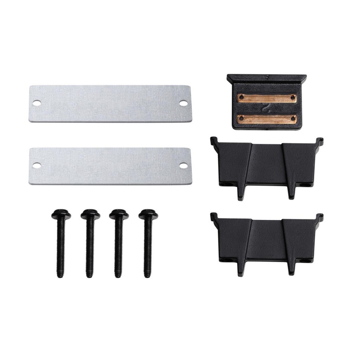 Подключение происходит за счет питания шинопровода одной фазой с помощью клемм подсоединения. Для создания поворотов и удлинения треков есть коннекторы. С их помощью несколько шинопроводов можно соединить в одну систему.