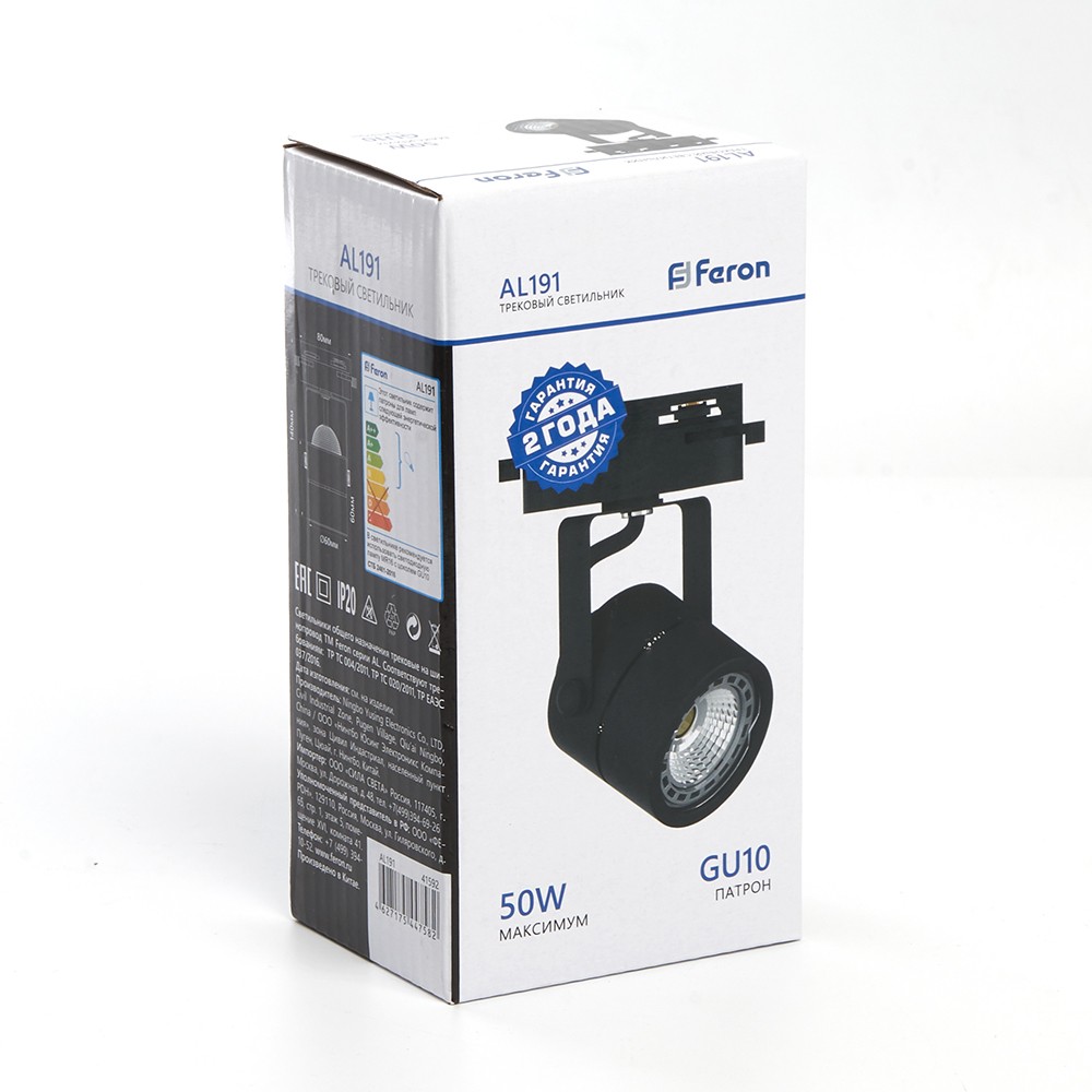 Светильник Feron AL191 трековый однофазный на шинопровод под лампу GU10 черный 41592 по цене 282 руб. с фотографией и техническими характеристиками. Для покупки товара нажмите кнопку "Купить" и перейдите в корзину или позвоните по телефону 8 (495) 585 32 60 или 8 (800) 222 23 53.