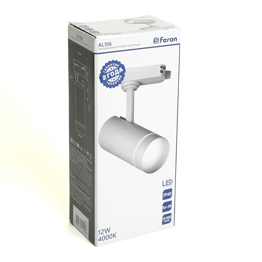 Трековый светильник можно двигать по шинопроводу в любое место трека, есть дополнительные регулировки, можно создавать зоналное освещение. Подходит для основного и декоративного освещения. Модель AL106 от производителя Feron с цветом корпуса Белый подходят для следующего типа трекового освещения - Однофазные трековые системы в качестве источника света используется Встроенные диоды LED. Светильник поможет создать качественное освещение в любом интерьере Светильник трековый на шинопровод, однофазный (ДПО) FERON AL106, 12W, 4000К (белый), 170-265V, 1080Lm, цвет белый, корпус алюминий, рассеиватель поликарбонат, вращение →350°/↓90°, 85*55*190 мм