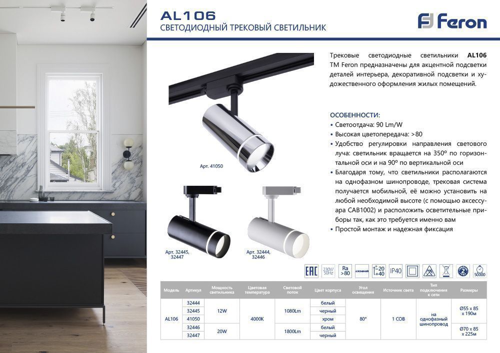 Трековые светодиодные светильники AL106 TM Feron артикул 32444 предназначены для акцентной подсветки деталей интерьера, декоративной подсветки и художественного оформления жилых помещений.