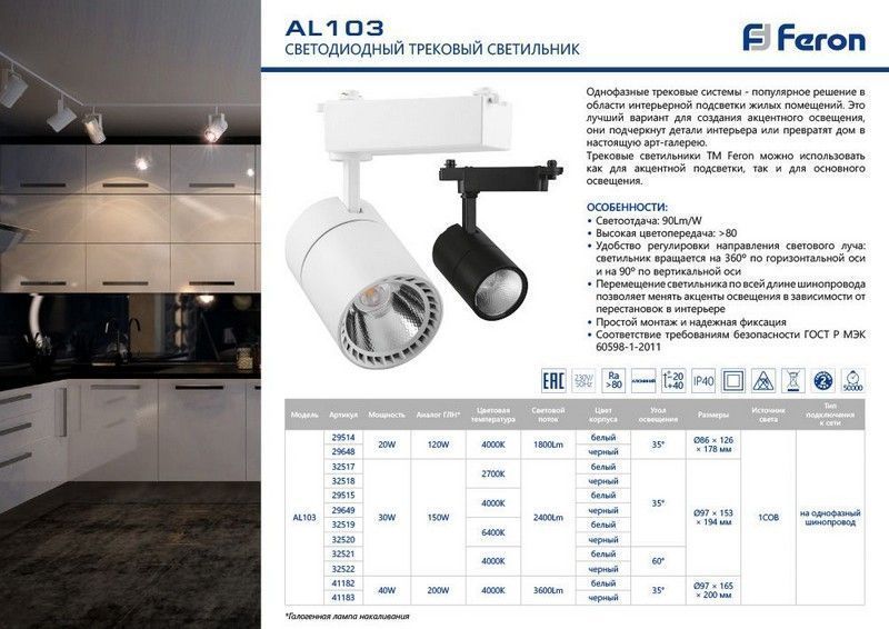 Светодиодный светильник Feron AL103 трековый на шинопровод 20W 4000K белый 35 градусов 29514 по цене 1 189 руб. с фотографией и техническими характеристиками. Для покупки товара нажмите кнопку "Купить" и перейдите в корзину или позвоните по телефону 8 (495) 585 32 60 или 8 (800) 222 23 53.