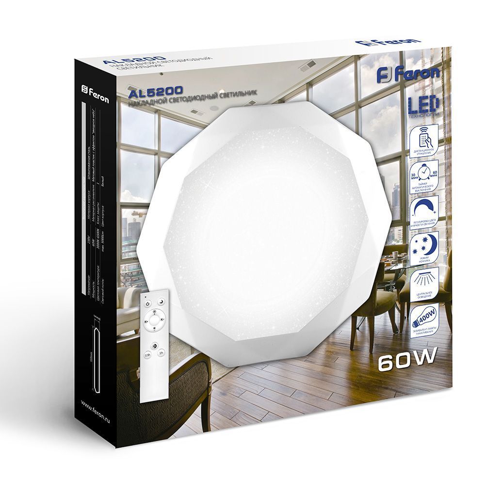 Светодиодный управляемый светильник накладной Feron AL5200 тарелка 60W 3000К-6500K белый 29516 по цене 1 137 руб. с фотографией и техническими характеристиками. Для покупки товара нажмите кнопку "Купить" и перейдите в корзину или позвоните по телефону 8 (495) 585 32 60 или 8 (800) 222 23 53.