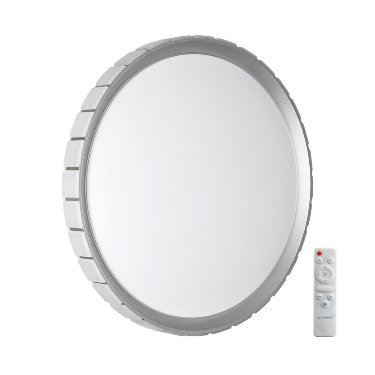Светильник 7696/EL линии KUPI SILVER состоит из металлического основания (базы) и пластикового рассеивателя. Материал рассеивателя - высококачественный пластик марки PMMA 2.0 белого цвета с матовой, гладкой поверхностью. Пластик обеспечивает светильнику равномерное рассеивание и хорошее светопропускание. Форма плафона: круглая, декорирована рельефным пластиковым светопропускающим ободом, цвет серебро. Степень защиты IP43 позволяет использовать светильник в определенных зонах влажных помещений. В комплект входит заменяемый LED модуль с линзами, мощностью 70Вт, которая соответствует лампе накаливания 610Вт. А также пульт ДУ (с креплением на стену), с помощью которого осуществляется плавное изменение цветовой температуры 3000-6000К, изменение яркости, переход в режим переключения теплого/белого/холодного/ночного света. Светильник имеет функцию "память".